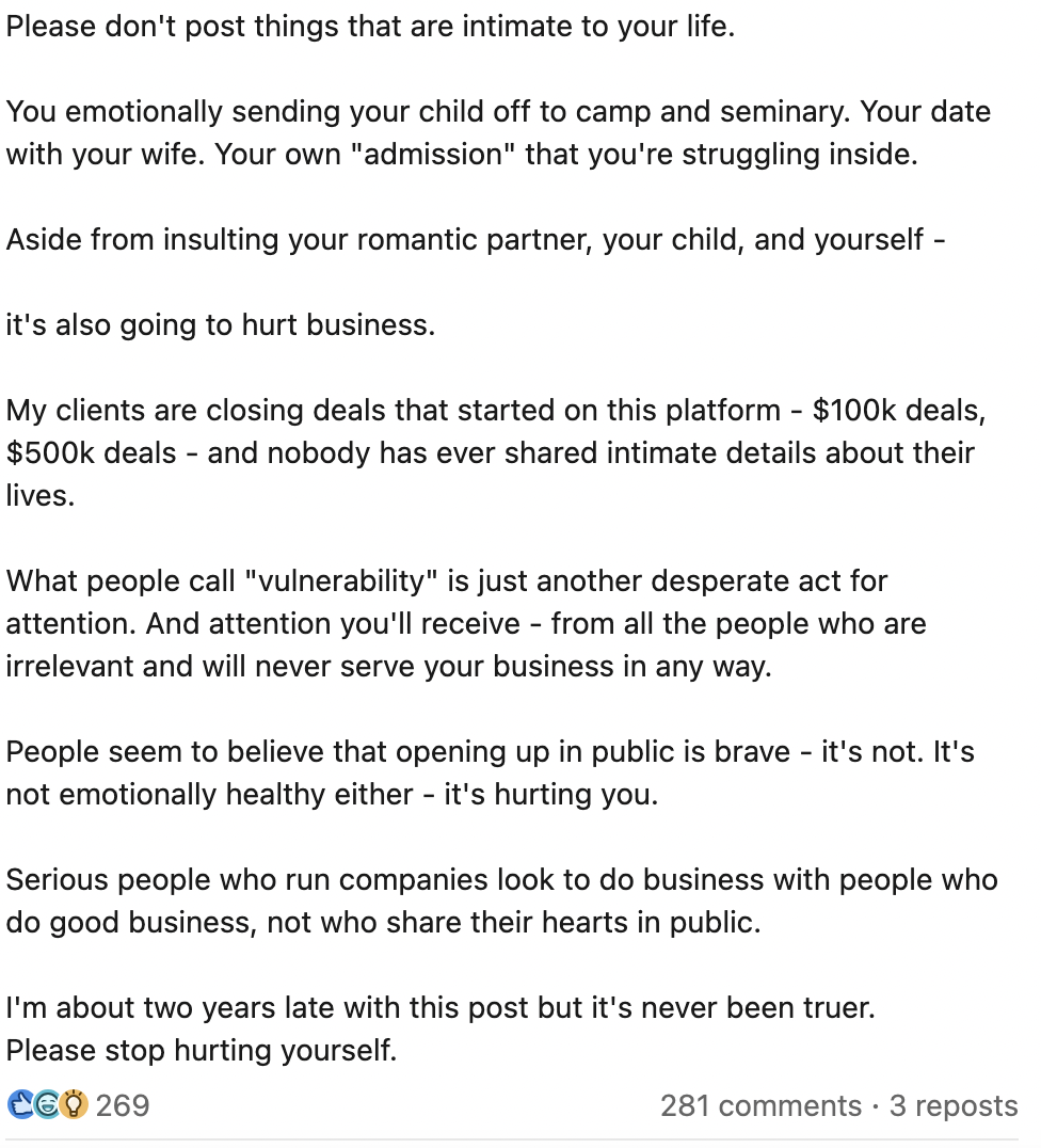 A while ago this LinkedIn post came across my feed arguing that people shouldn’t post personal stuff on the platform.
